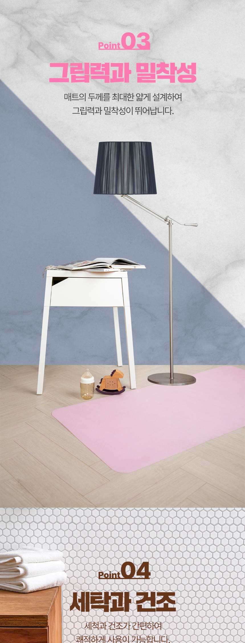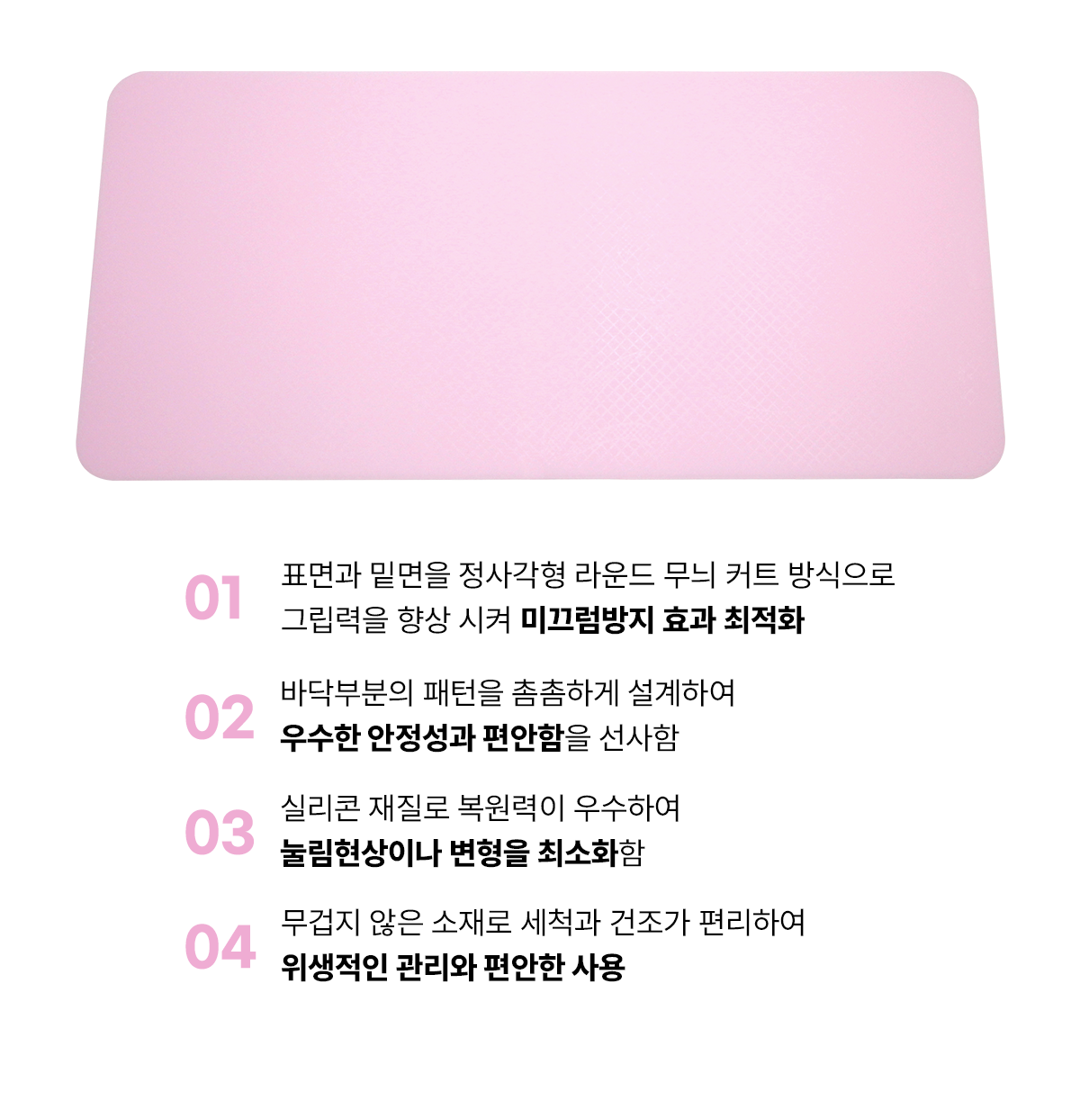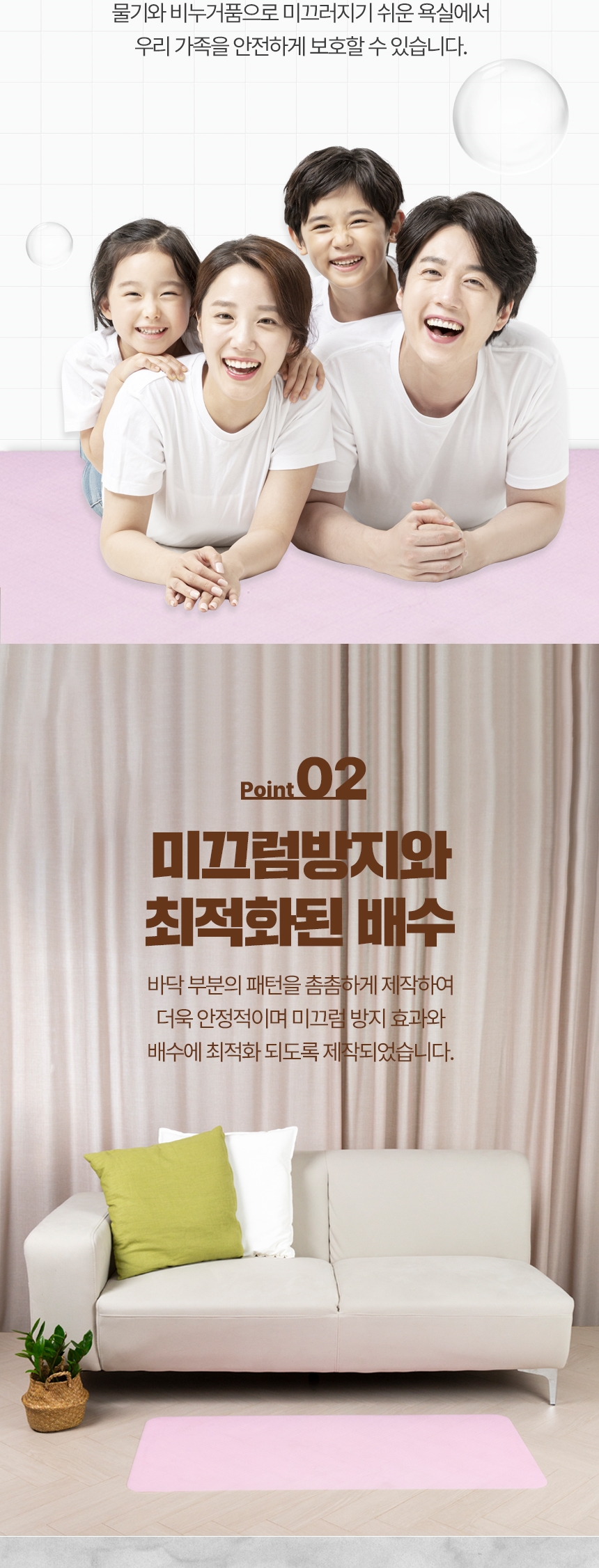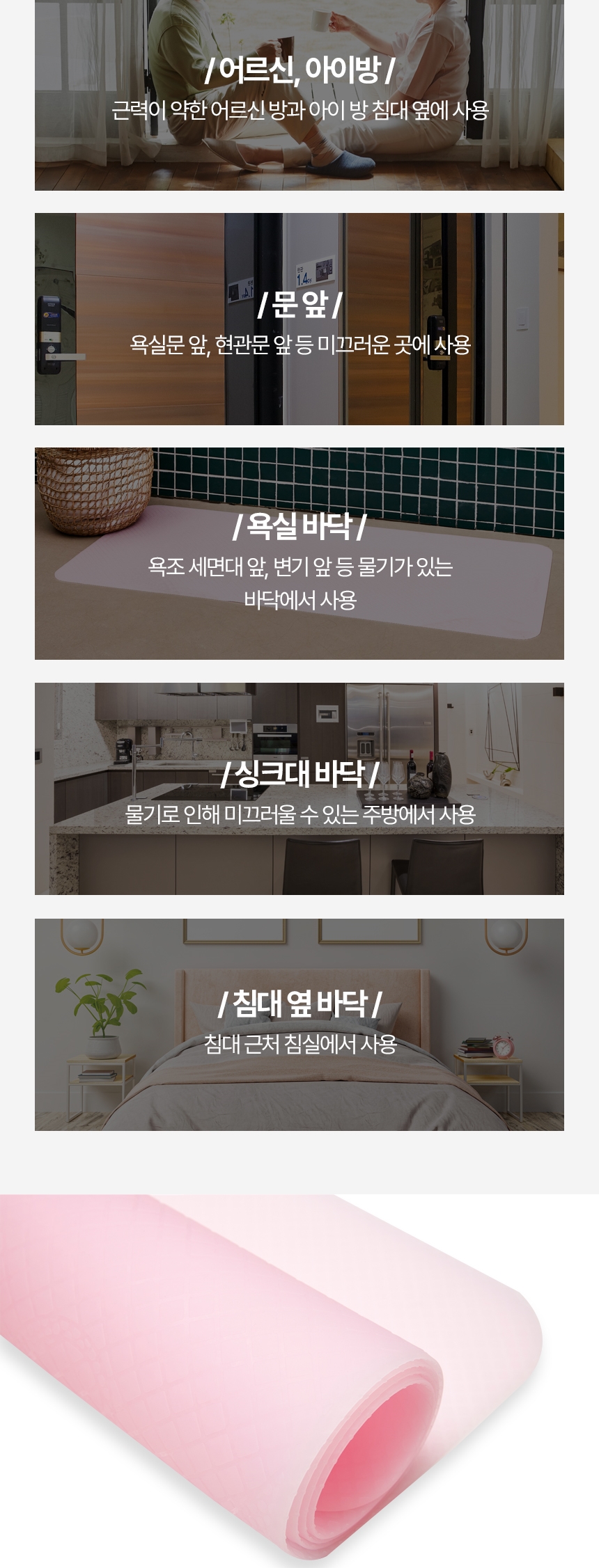 싱크대 앞, 화장실 앞, 현관 앞, 침대 앞 등 미끄러운 곳에 사용 가능하며